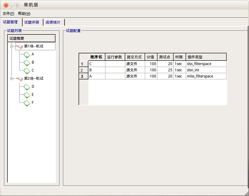 我们返回Arbiter,在试题管理选项卡中右键-添加考试,在第一场上添加三个试题,更改试题名称、(试题分值)、测试点数量、时间限制、内存限制和比较方式(我不知道spj怎么设置),如果有需要还可以设置编译选项。