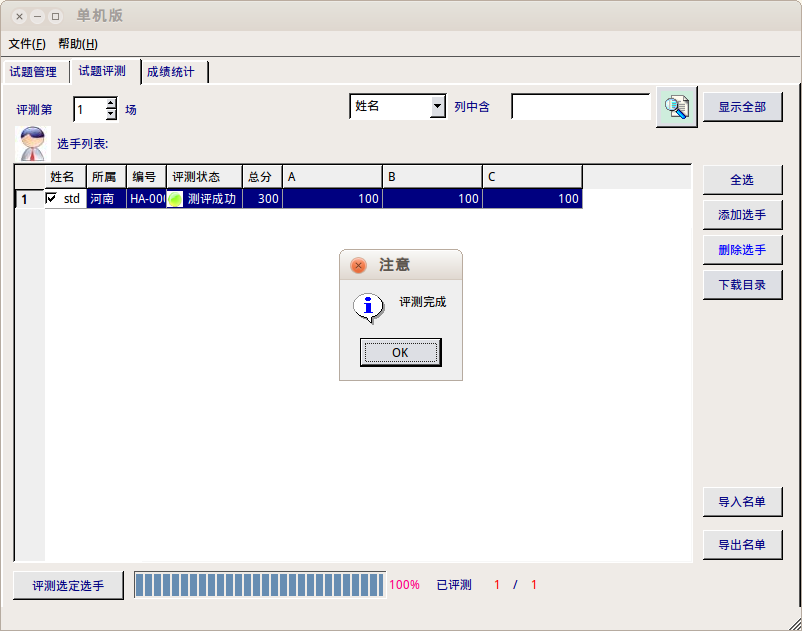 添加好后,更改左上角的场次,勾选要测评的选手然后点击评测选定选手,等待评 测。